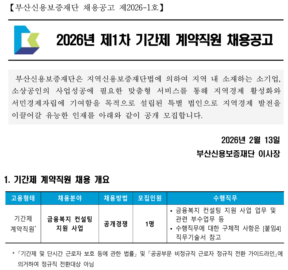 부산신용보증재단 2026년 제1차 기간제 계약직원 채용공고