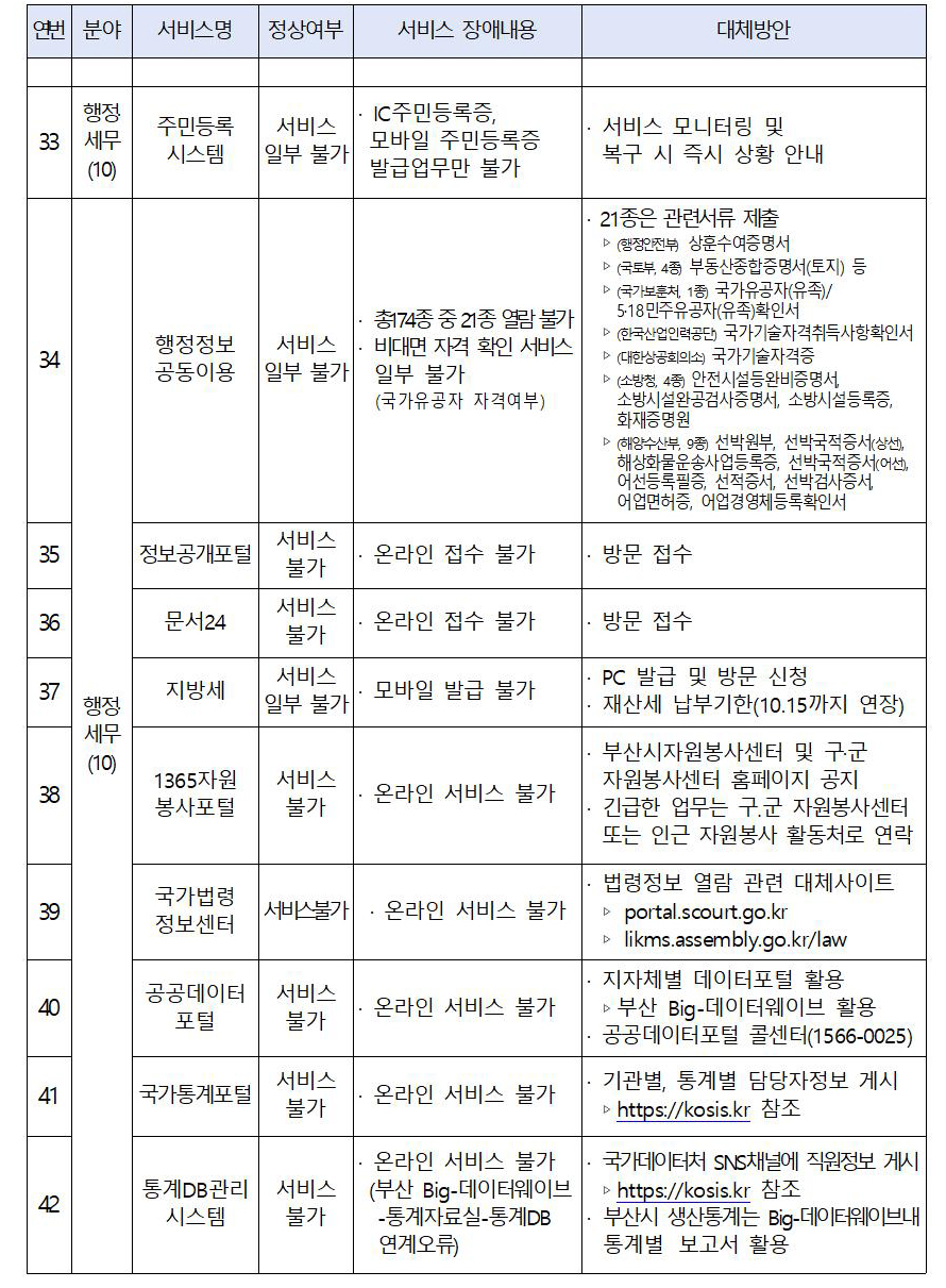 국가정보자원관리원 전산시설 화재발생으로 인한 부산시 시스템 일부 서비스 중단 안내