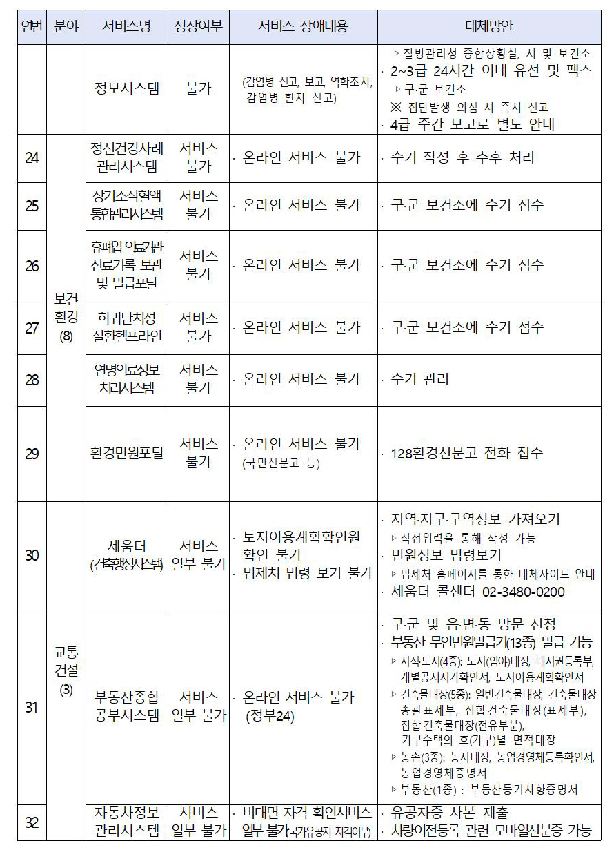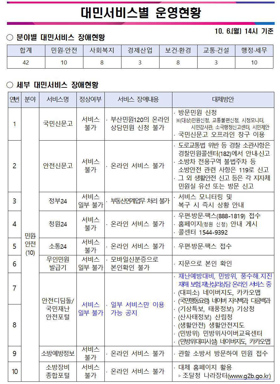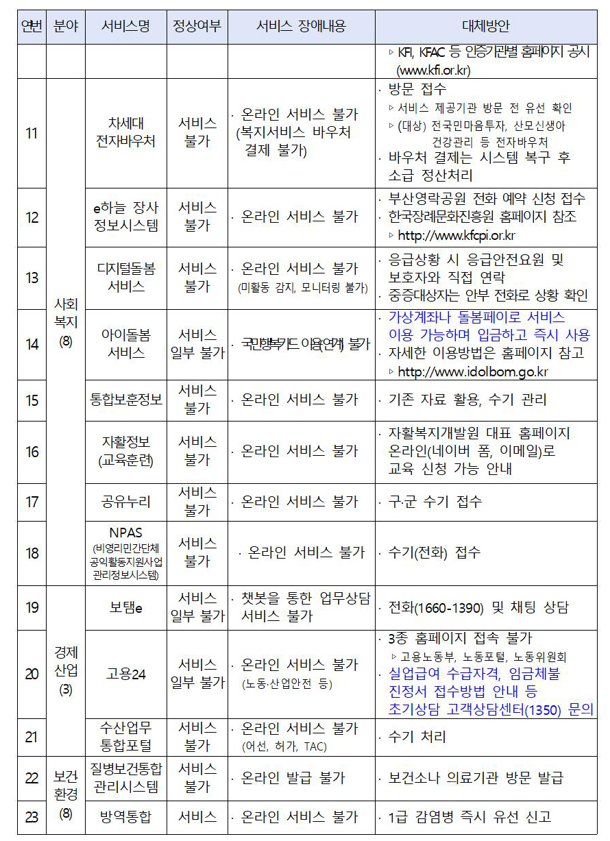 서비스 복구 현황 및 공식 안내는 각 부처와 기관의 공식 홈페이지 공지사항에서만 확인해 주시기 바랍니다.