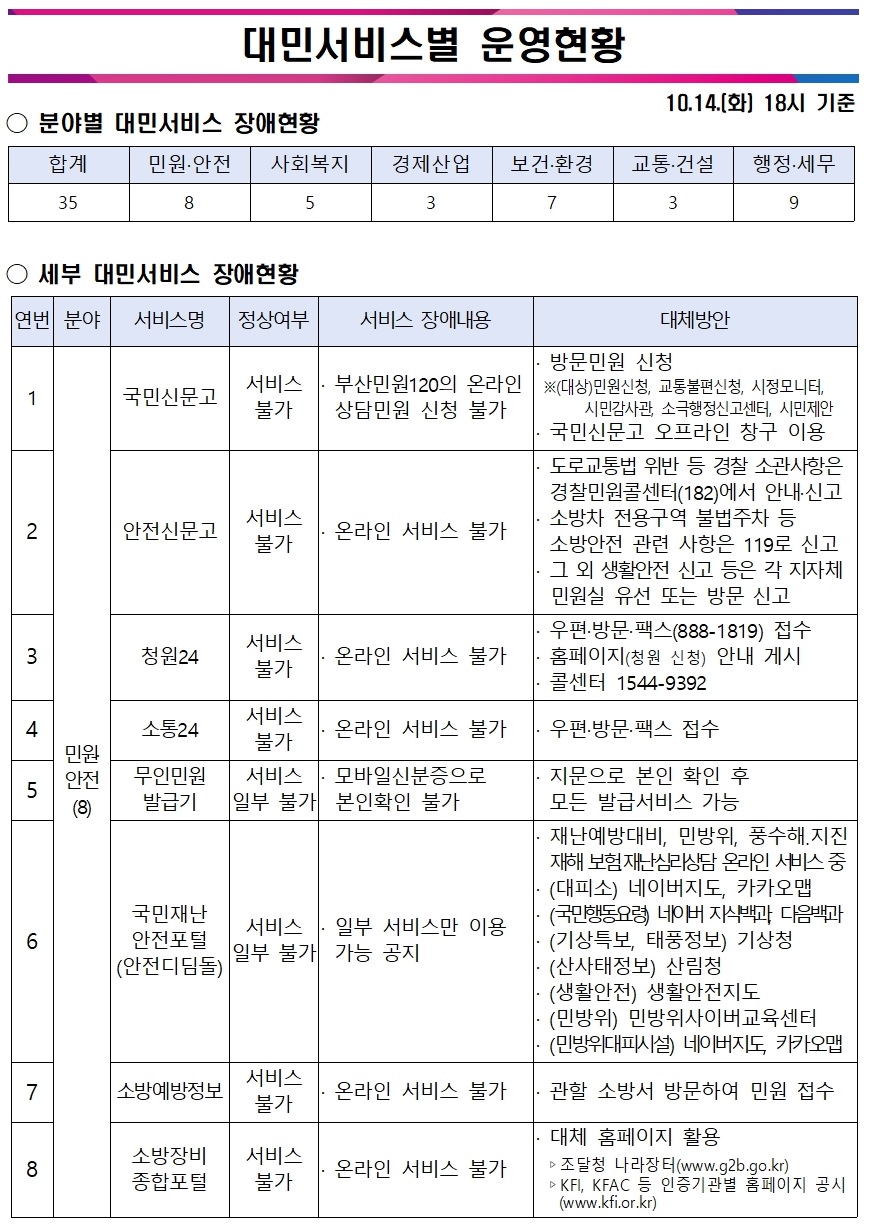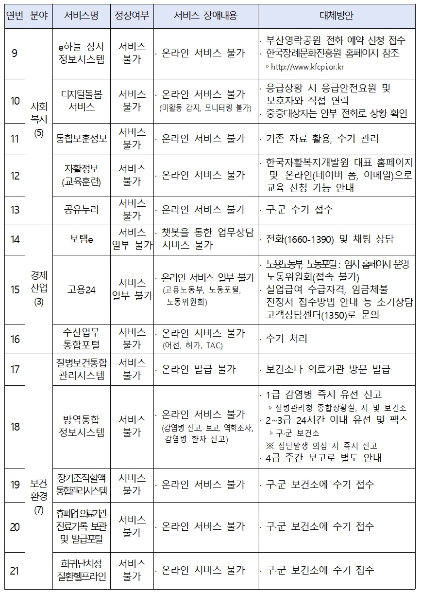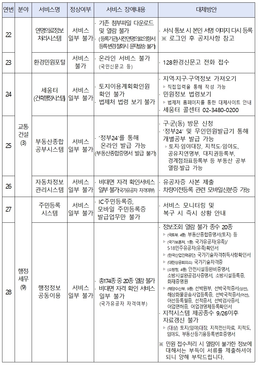 서비스 복구 현황 및 공식 안내는 각 부처와 기관의 공식 홈페이지 공지사항에서만 확인해 주시기 바랍니다.