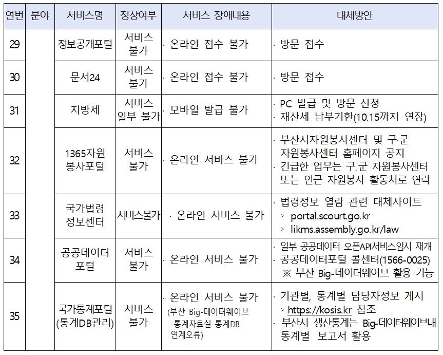 국가정보자원관리원 전산시설 화재발생으로 인한 부산시 시스템 일부 서비스 중단 안내