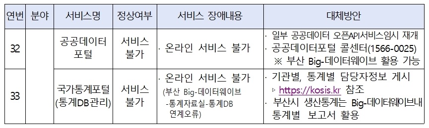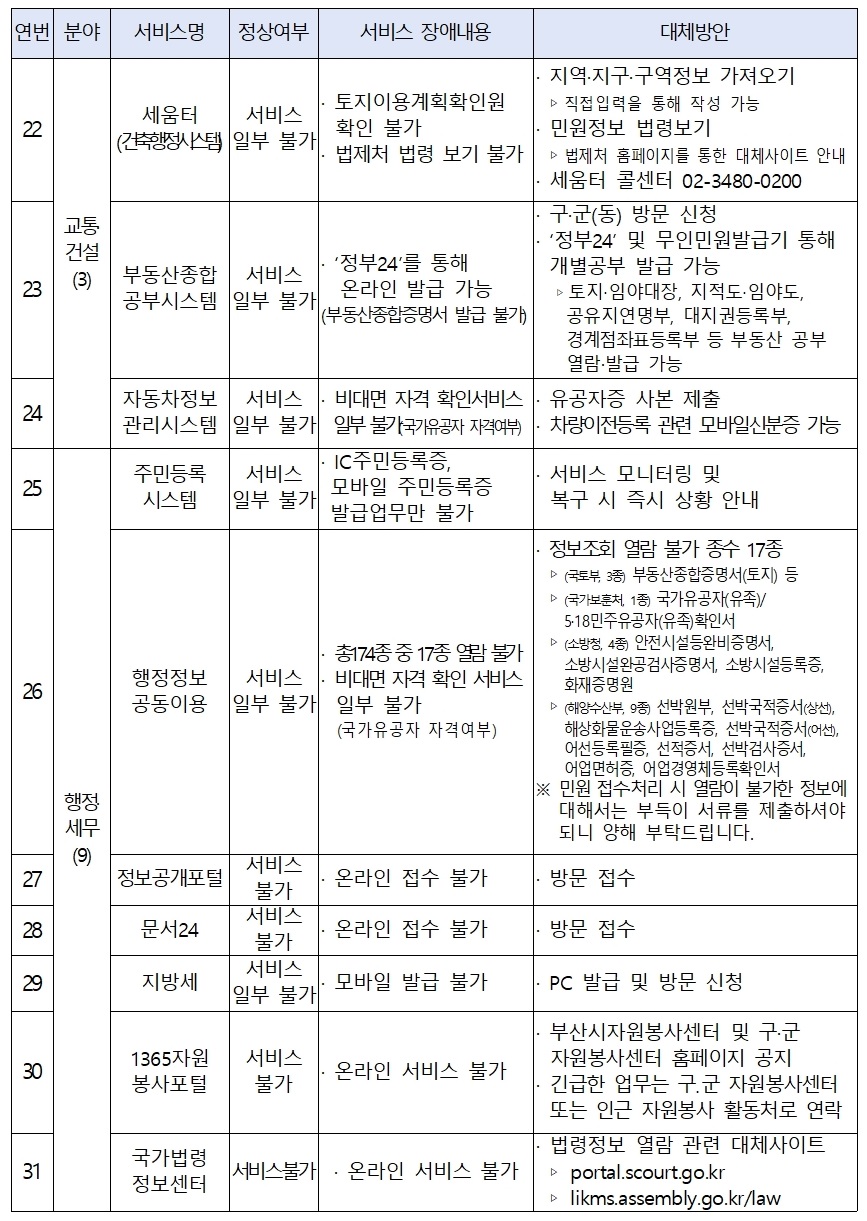 국가정보자원관리원 전산시설 화재발생으로 인한 부산시 시스템 일부 서비스 중단 안내