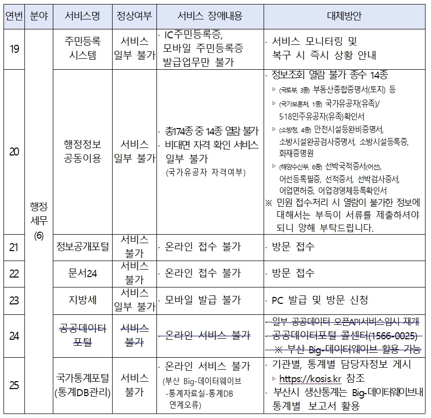 국가정보자원관리원 전산시설 화재발생으로 인한 부산시 시스템 일부 서비스 중단 안내