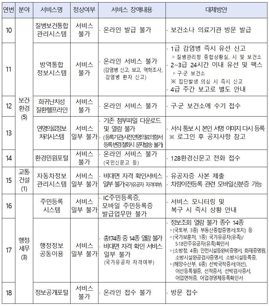 서비스 복구 현황 및 공식 안내는 각 부처와 기관의 공식 홈페이지 공지사항에서만 확인해 주시기 바랍니다.