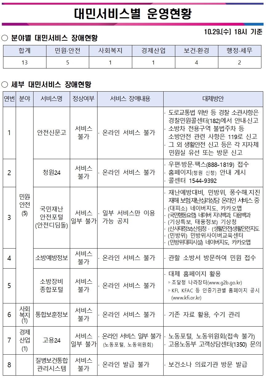 행정정보시스템 화재 장애 대체수단 제공 서비스 목록('25.10.29. 12시 기준) - 붙임참고