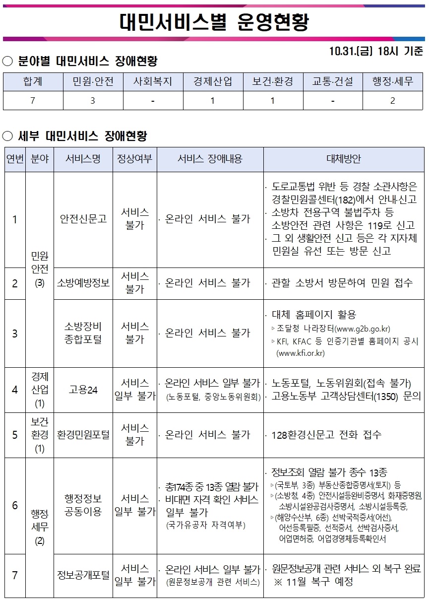 서비스 복구 현황 및 공식 안내는 각 부처와 기관의 공식 홈페이지 공지사항에서만 확인해 주시기 바랍니다.
