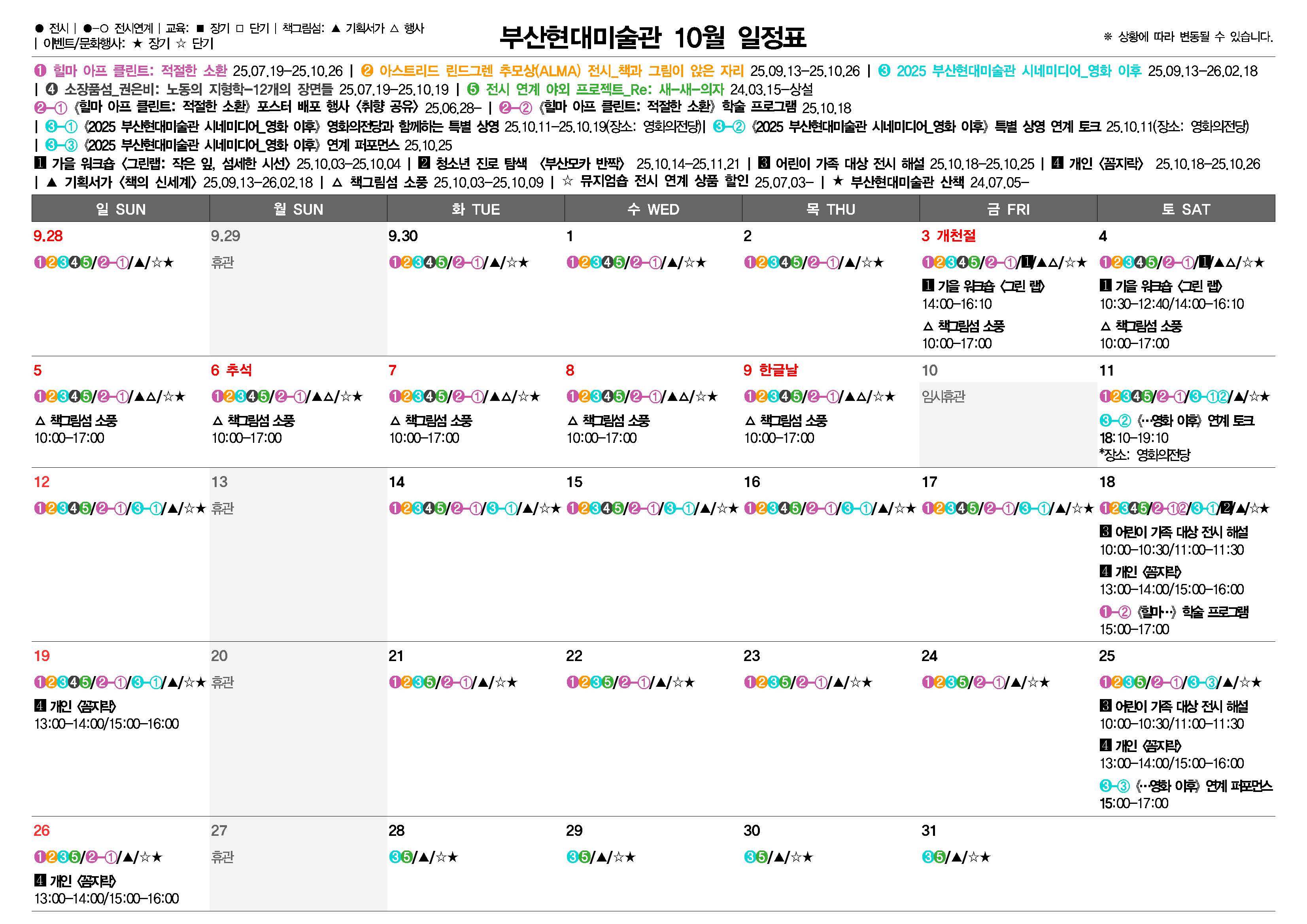 부산현대미술관 월별 일정(2025.10) 안내 드립니다. 관람 및 이용에 참고하시기 바랍니다.