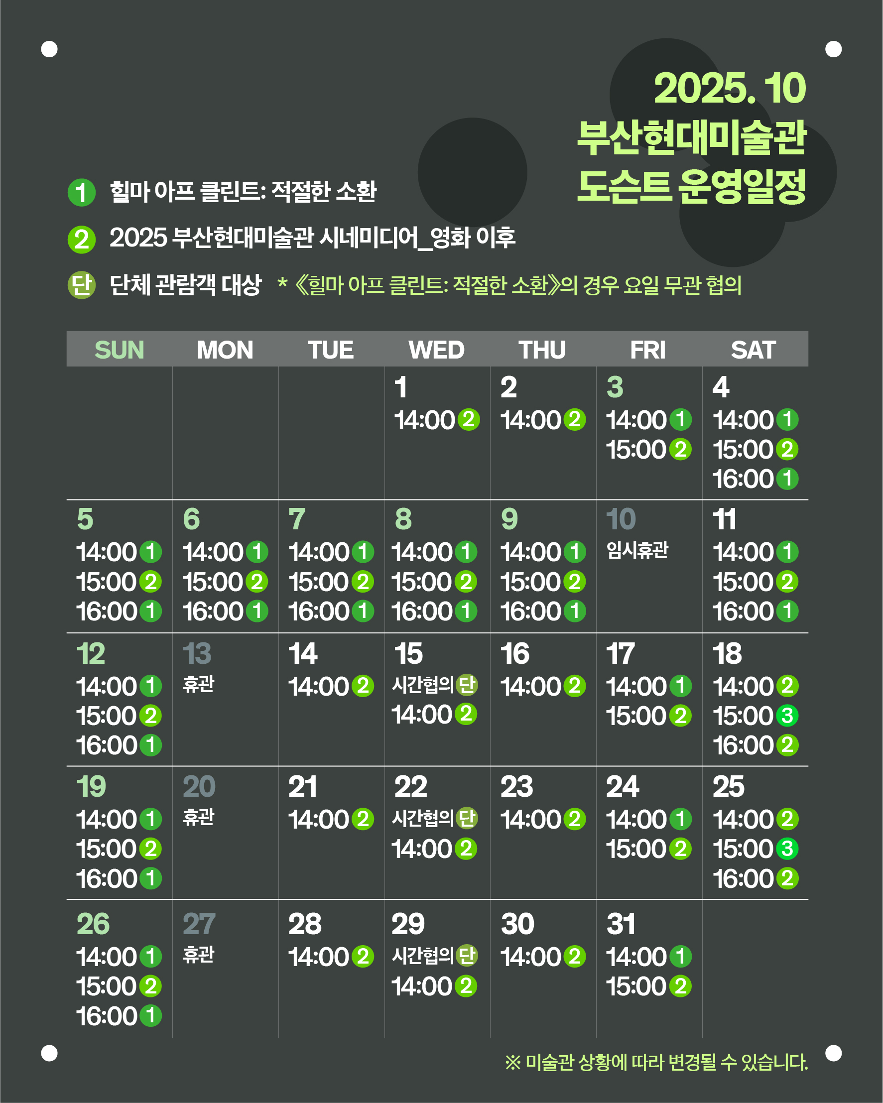 ※ 《2025 부산현대미술관 시네미디어_영화 이후》는 관람객의 몰입과 개별 사유를 중시하여, 도슨트는 전시 개념과 주요 내용을 간략히 소개한 후 자유 관람 형식으로 진행됩니다. 도슨트 투어 참여 시 참고해 주시기 바랍니다.