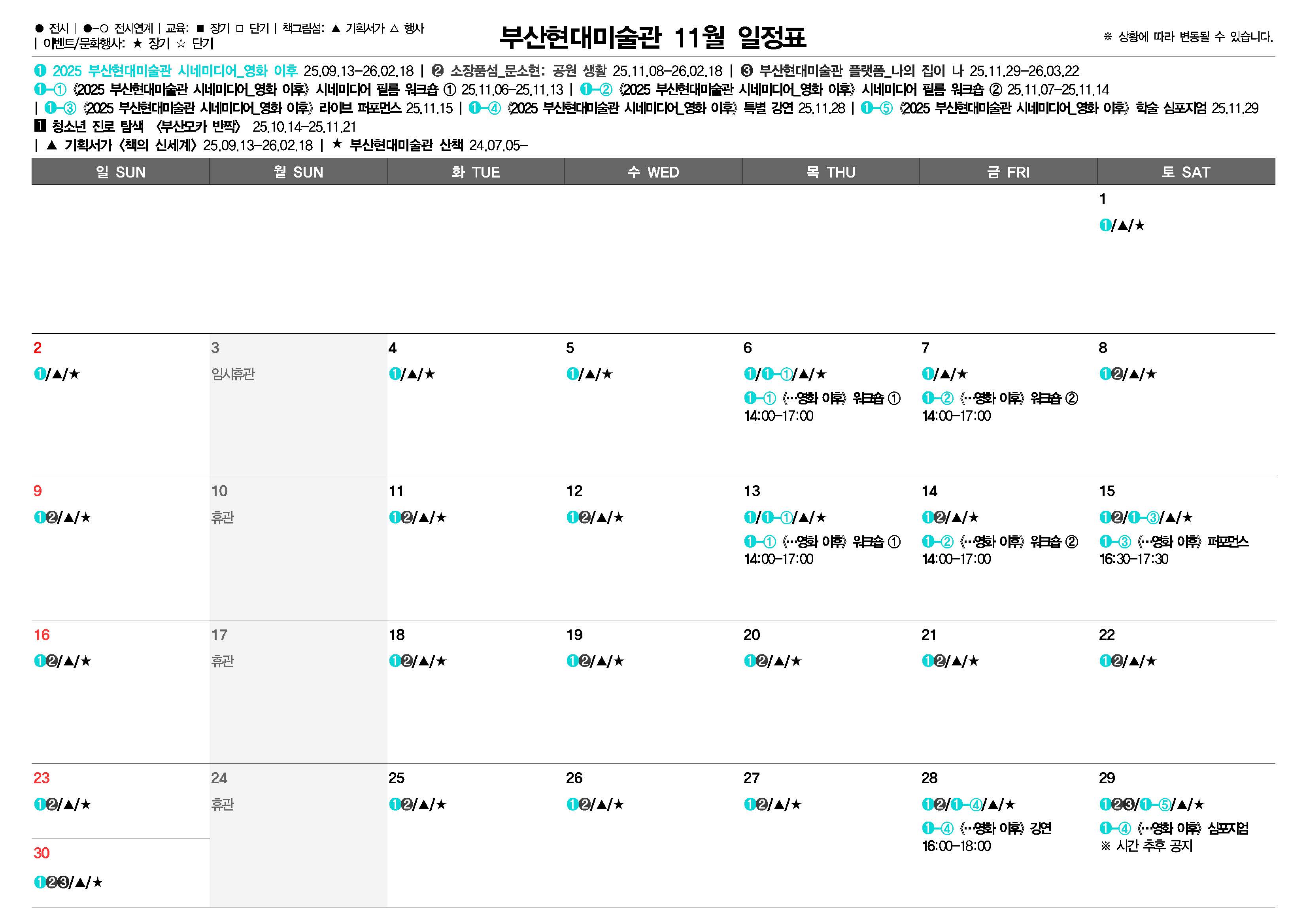 부산현대미술관 월별 일정(2025.11) 안내 드립니다. 관람 및 이용에 참고하시기 바랍니다.