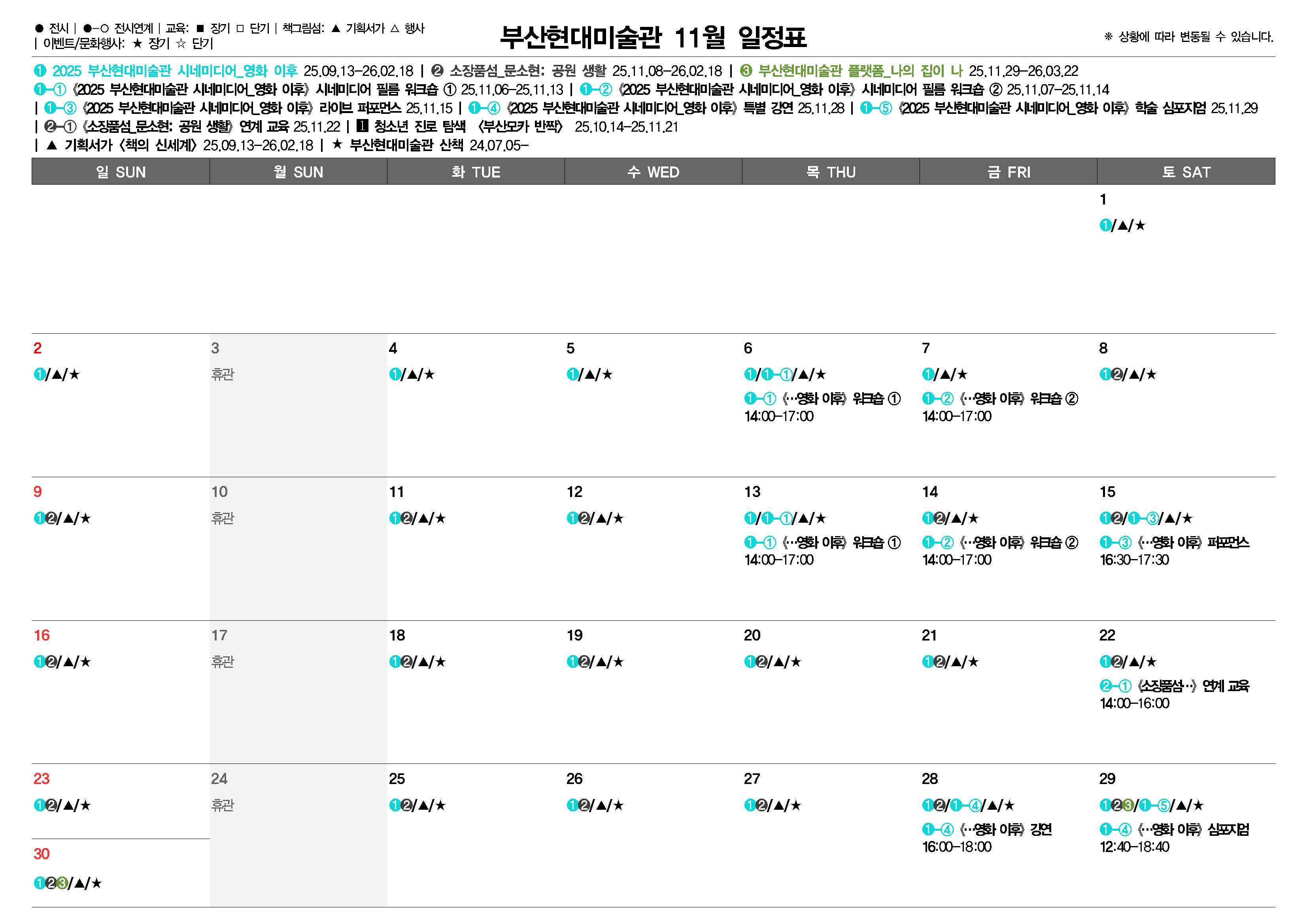 부산현대미술관 월별 일정(2025.11) 안내 드립니다. 관람 및 이용에 참고하시기 바랍니다.