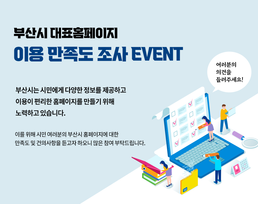 시민 여러분이 만족할 수 있는 홈페이지 운영을 위하여 시민 여러분의 부산시 홈페이지에 대한 만족도 및 건의사항을