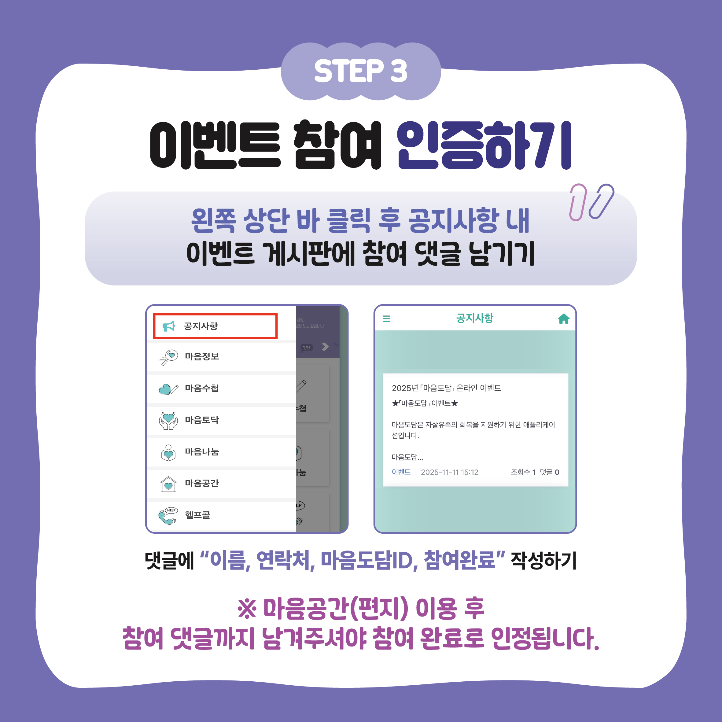 ③ 「마음도담」 내 공지사항에 개인정보와 참여완료 댓글 남기기