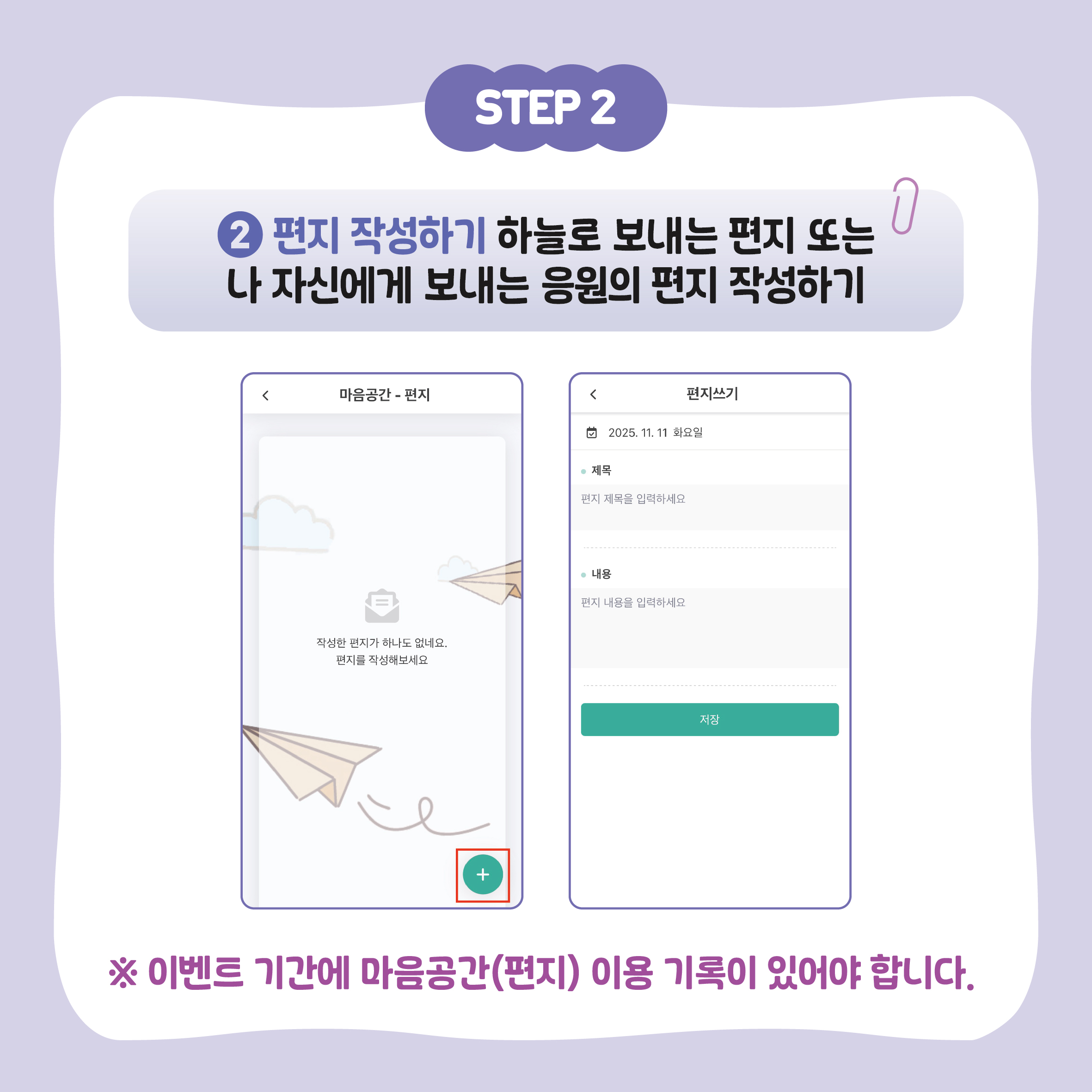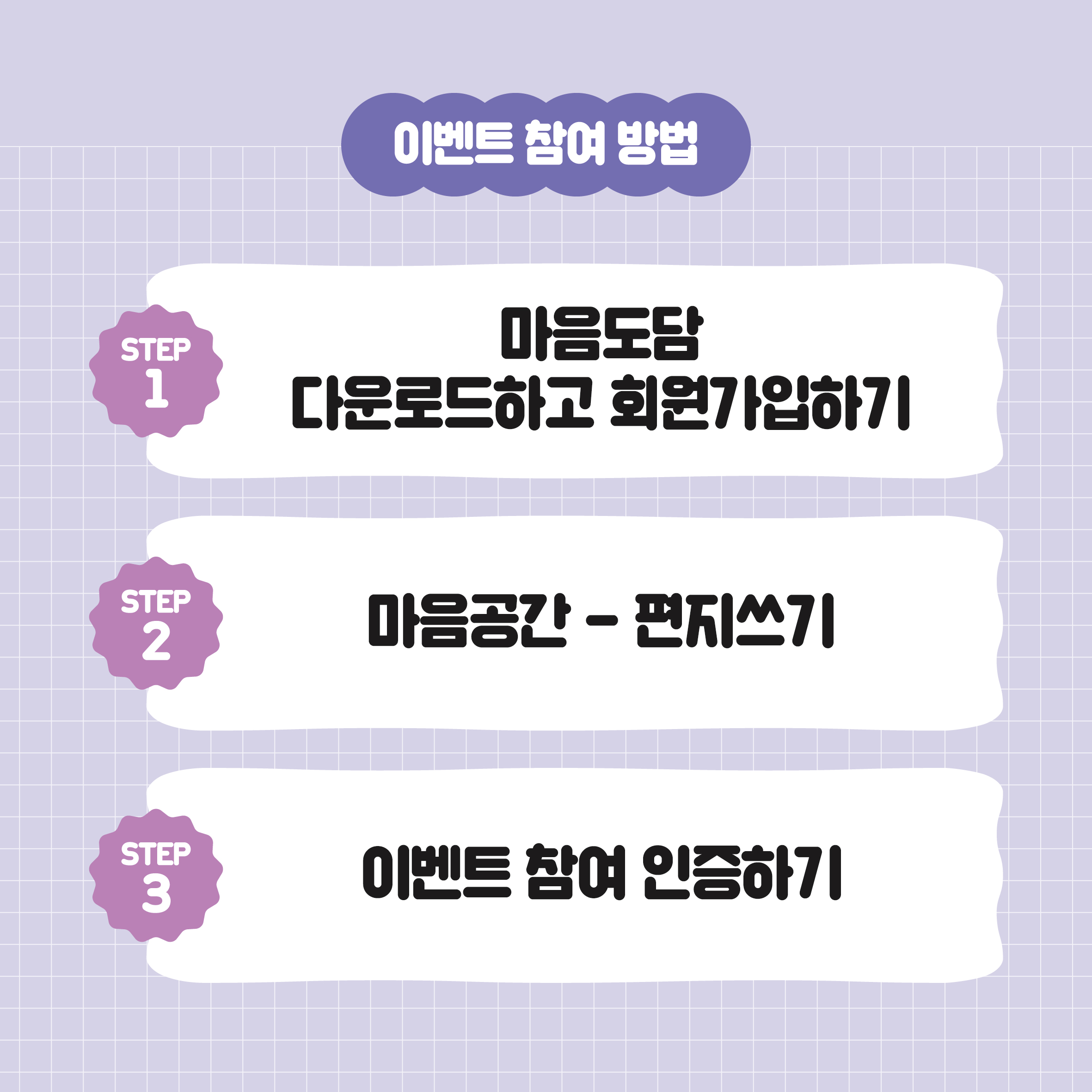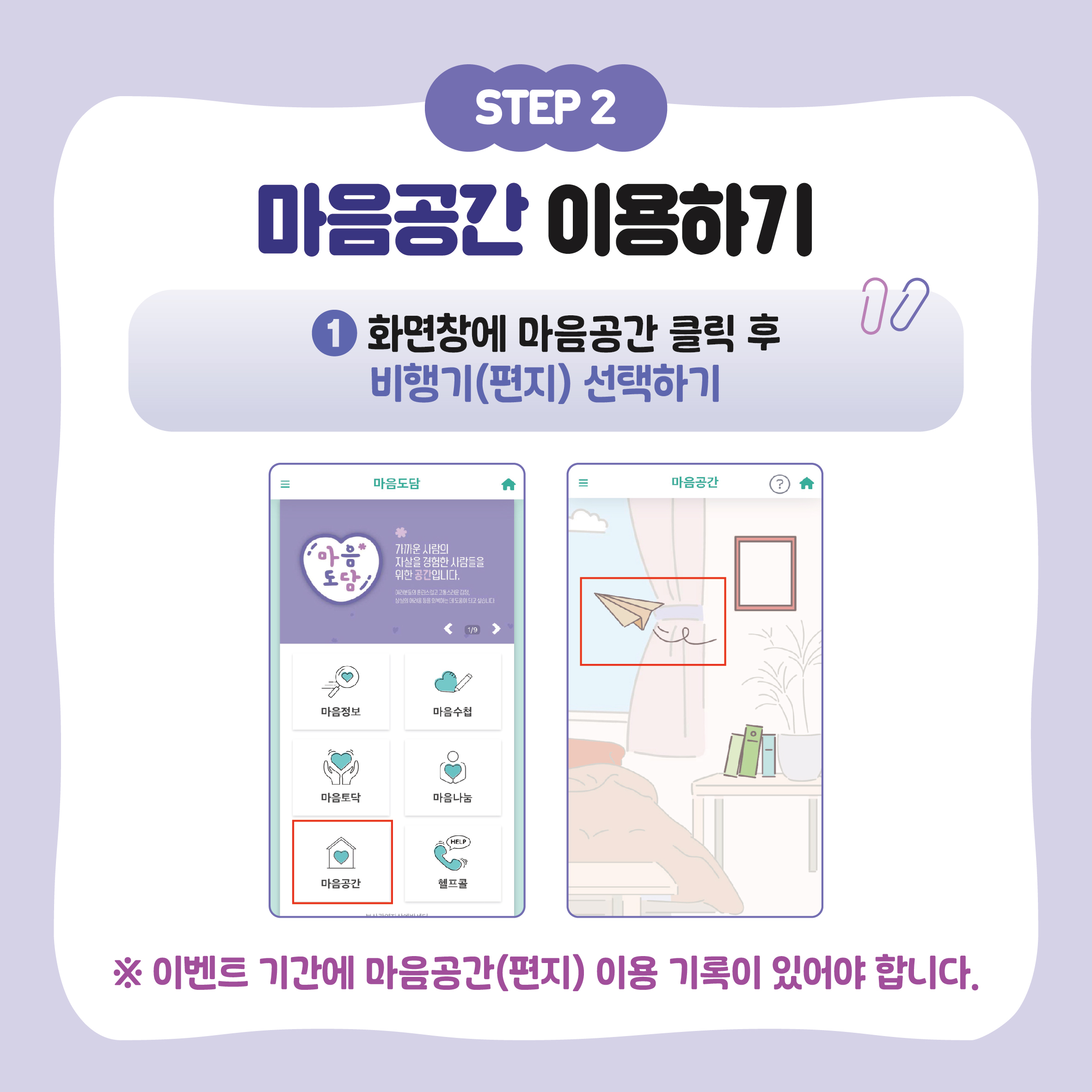 - 이벤트 기간 내 마음공간(편지) 이용 및 이벤트 참여 인증을 한 경우 이벤트 참여로 인증됩니다.
