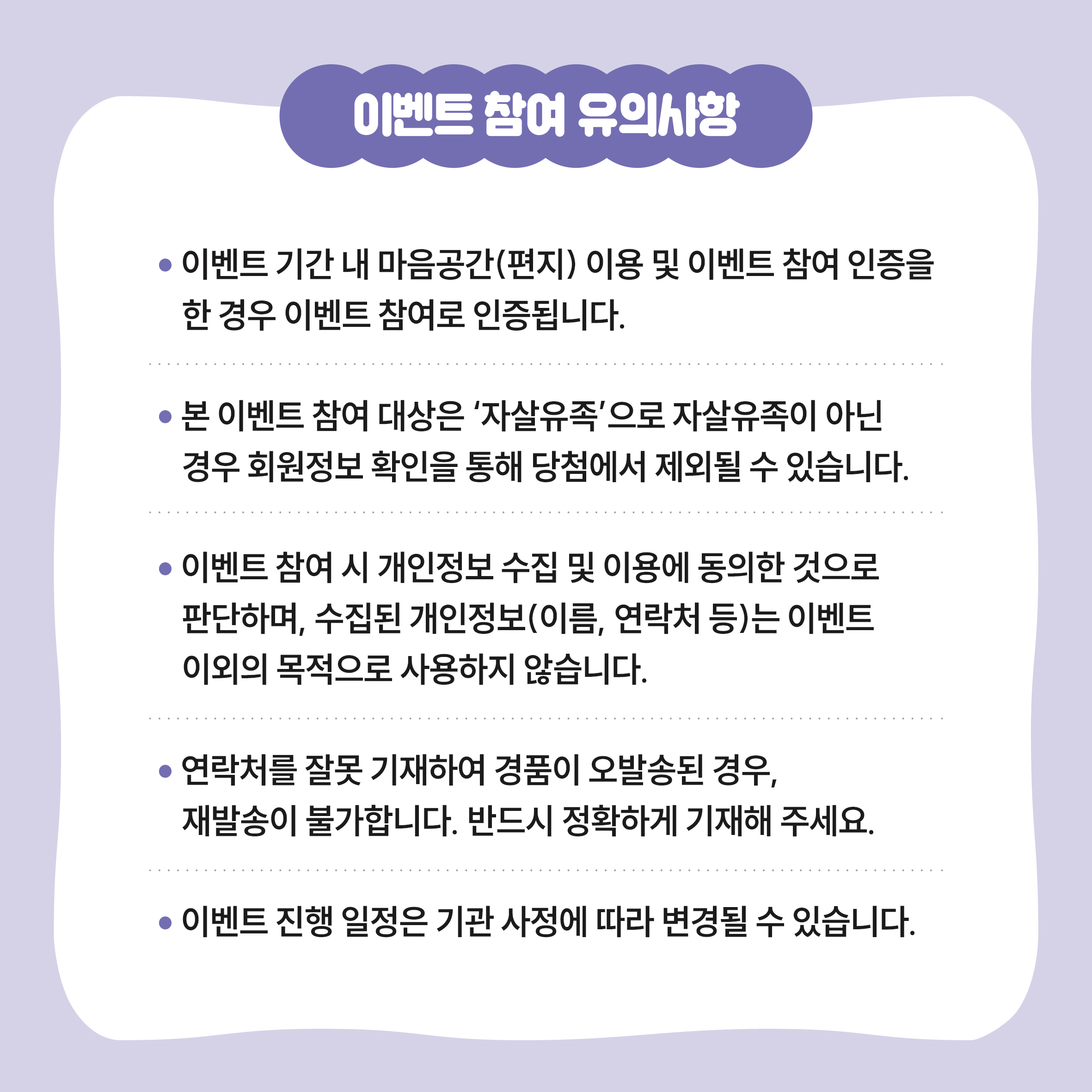 - 본 이벤트 참여 대상은 ‘자살유족’으로 자살유족이아닌 경우 회원정보 확인을 통해 당첨에서 제외될 수 있습니다.