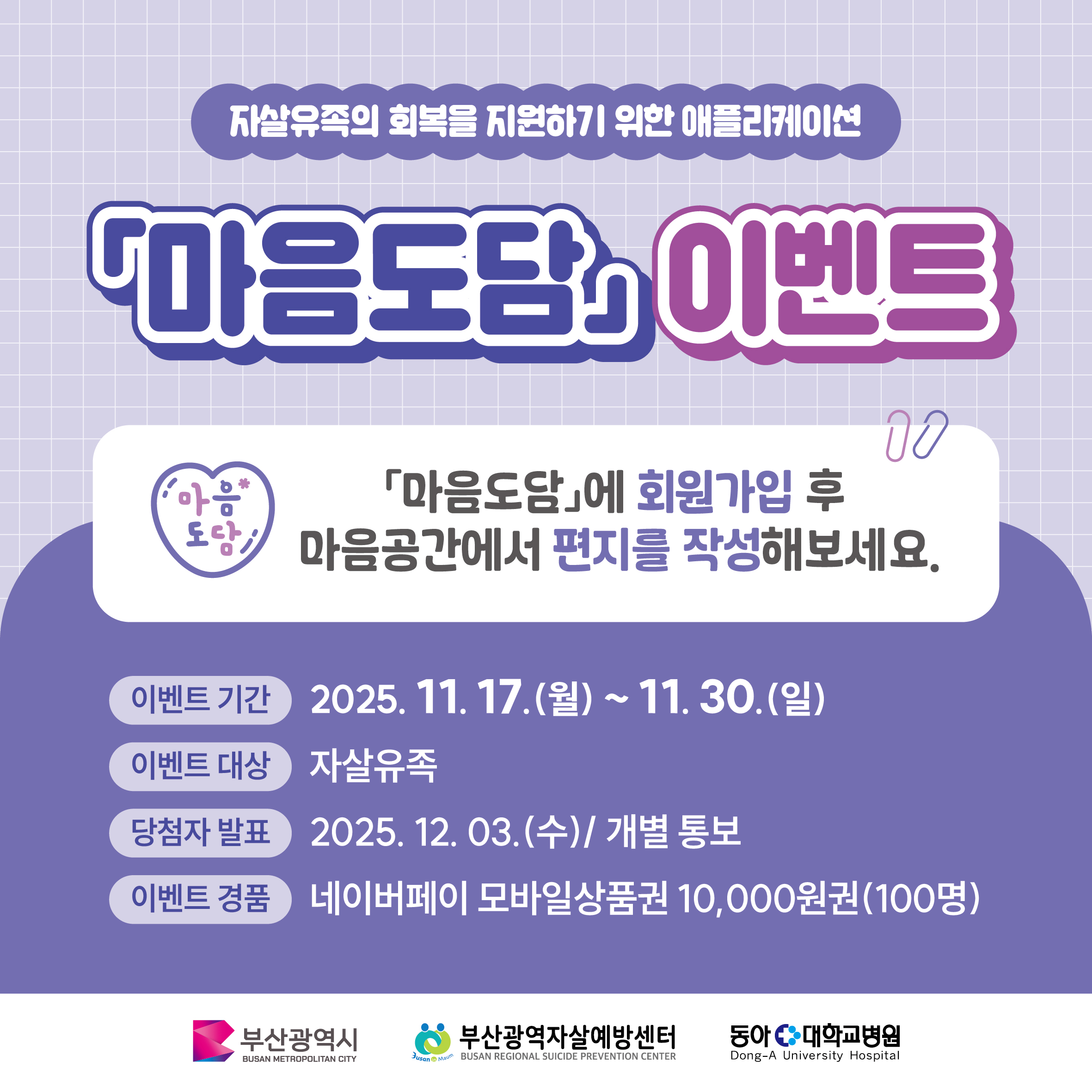 부산광역자살예방센터에서는 자살유족의 회복을 지원하기 위해 「마음도담」 애플리케이션을 운영하고 있습니다. 마음도담 애플리케이션 다운로드 및 회원가입, 마음도담 내 마음공간(편지쓰기)을 이용하고 이벤트에 참여해 주세요!!