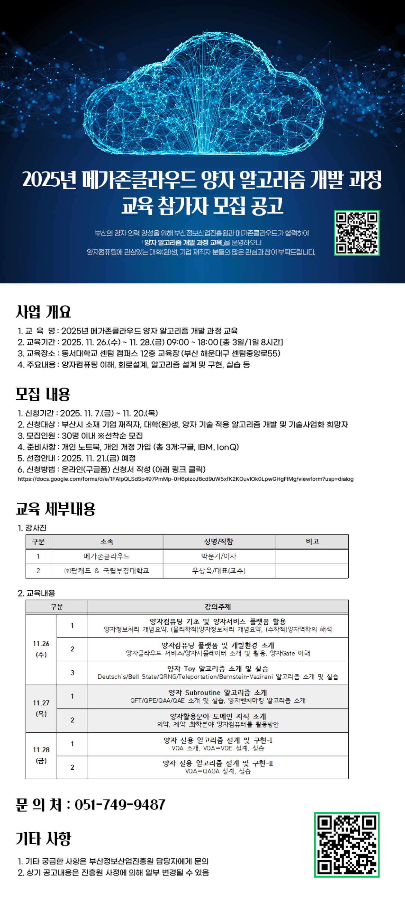 신청대상 부산시 소재 기업 재직자대학생양자기술 적용 알고리즘 개발 및 기술사업화 희망자 30명 이내(선착순)