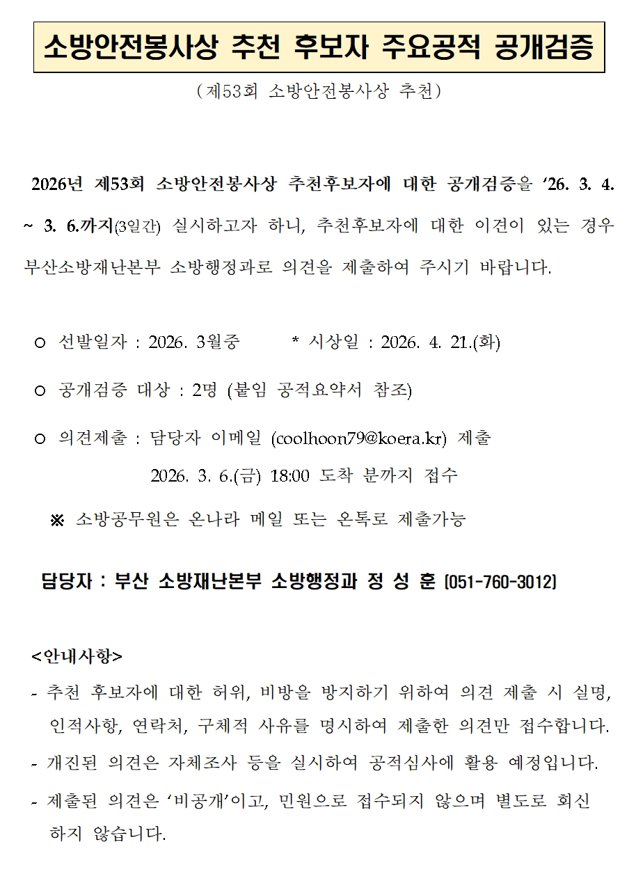 제53회 소방안전봉사상 추천후보자 공개검증 알림