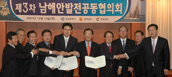 허남식 부산시장과 김태호 경남지사,박준영 전남지사 등 남해안 3개 시·도 지사와 조길우 부산시의회 의장 등 3개 시·도 의회 의장은 지난 13일 경남 통영시 충무마리나리조트에서 `남해안 발전 공동협의회'를 열고 이 같은 내용의 합의문을 채택했다.협의회 위원은 아니지만 앞으로 남해안과 제주도간 협력을 위해 김태환 제주지사도 옵서버로 참석했다.