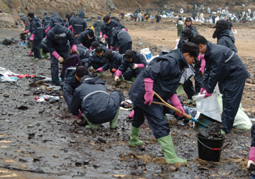 사진설명: 부산시민과 공무원들이 유조선 기름유출 사고로 기름범벅이 된 태안반도를 되살리기 위해 나서고 있다(사진은 지난 11∼13일 충남 태안군 천리포해수욕장에서 기름제거 작업을 벌이고 있는 부산시 공무원).