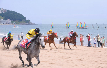 부산 해수욕장이 잇달아 문을 열고 있다(사진은 지난 1일 해운대 해수욕장 개장식에서 열린 경주마 해변경주 이벤트).