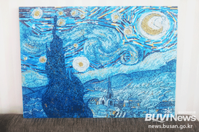 부산시는 6일 ‘제5회 자원순환의 날’을 맞아 다채로운 행사를 펼친다(사진은 자원재활용 작품전시회에서 선보일 자원재활용 공모전 대상작. 스테이플러 침과 파쇄종이를 이용해 고흐의 작품 ‘별이 빛나는 밤’을 재현했다).부산시는 기념식에 이어 오전 11시 부산시청 녹음광장에서 ‘자원재활용 작품전시회’를 연다. 생활용품을 재활용한 ‘쓰레기 생명을 불어넣다’, 폐현수막을 이용한 ‘선풍기가 옷을 입다’ 등 유명 전문가들의 작품을 비롯해 자원재활용 공모전 수상작, 각 구·군 출품작, ‘우리동네목공소’·한국문화예술진흥회·‘담쟁이’·가치예술운동 등 민간단체 참여작 등 140여점을 선보인다. 이 자원재활용 작품들은 7일부터 부산시청 도시철도 지하통로로 자리를 옮겨 오는 13일까지 시민들을 만날 예정이다.