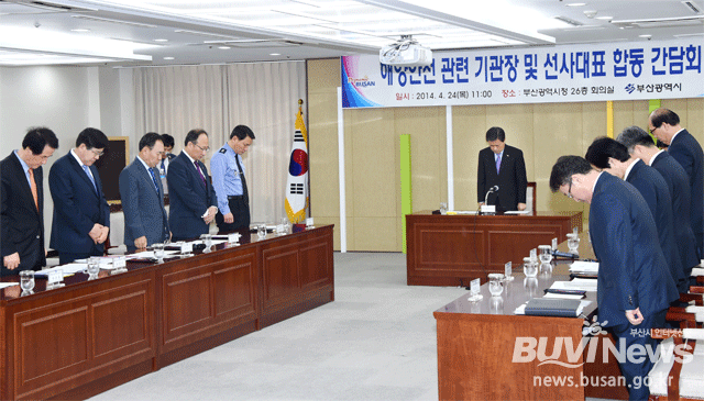 부산지역 해양안전 관련 기관·단체장과 선사 대표들이 여객선 세월호 침몰 참사와 관련해 긴급 간담회를 열고 철저한 선박 안전관리에 나서기로 했다(사진은 지난 24일 부산시청에서 가진 긴급 간담회에 앞서 참석자들이 묵념을 하는 모습).부산시는 이날 간담회에 최근 5년간 부산 인근 해역에서 발생한 선박사고의 통계자료를 발표, 대부분의 사고가 승선원의 과실로 인한 것으로 나타났다. 지난 2009년부터 2013년까지 부산 인근 해역에서 발생한 선박사고는 모두 93건. 충돌이나 접촉사고가 63건으로 가장 많고, 좌초 7건, 전복 6건, 침몰 4건 등이었다. 사고 원인은 84.9%인 79건이 운항 부주의 등 승선원의 과실이었으며, 기기결함 5건, 화물취급 부주의 3건 등으로 조사됐다.