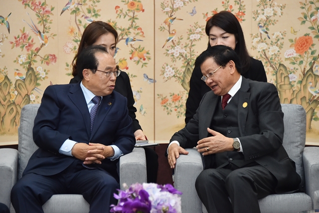동참을 요청했다(사진은 오거돈 부산시장과 통룬 시술릿 라오스 총리의 양자 면담 모습).