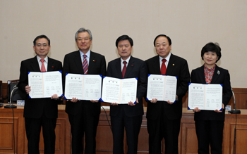 사진은 왼쪽부터 김종렬 부산일보 사장, 신정택 부산상의 회장, 허남식 부산시장, 제종모 시의회 의장, 조봉자 부산YWCA 사무총장.