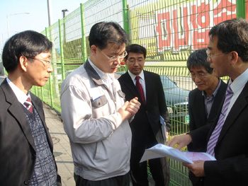 부산시 기업옴부즈맨인 김명수 실장(사진 맨 왼쪽)이 기업 현장을 방문해 애로 사항을 듣고 있다.