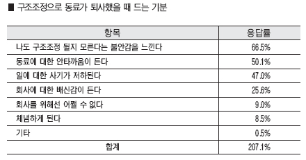 구조조정으로 사내 직장동료가 퇴사했다고 답한 응답자 중 66.5%가 '자신도 구조조정 될지 모른다는 불안감을 느낀다'고 답했다.
