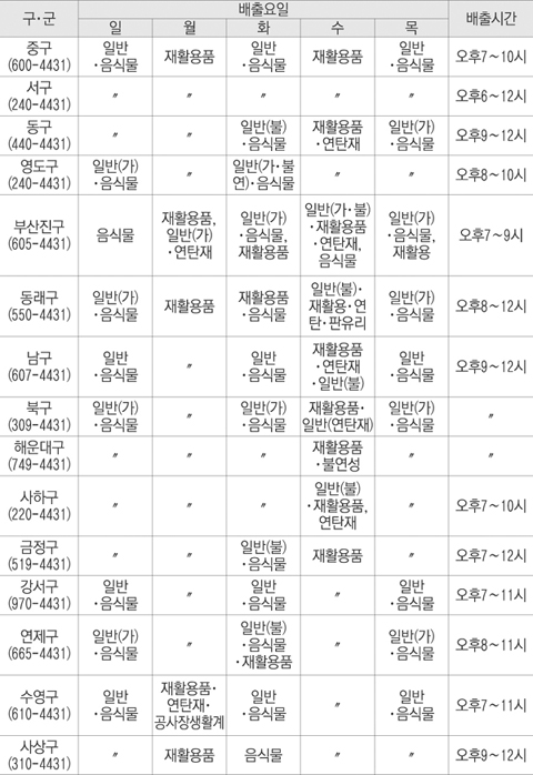 부산시는 생활쓰레기 배출 체계가 주5일로 바뀌면서 현재 요일별로 정해진 쓰레기 배출 품목과 시간도 달라진다. 지금까지 토요일 저녁에만 배출이 금지했지만, 앞으로는 금·토요일 저녁 모두 쓰레기를 배출하면 안 된다.