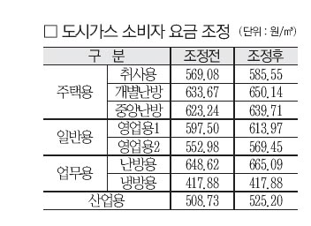 부산시는 도시가스 도매 요금 인상에 따라 도시가스 소비자 요금을 평균 ㎥당 582.72원에서 599.19원으로 6.47원 올렸다. 주택 취사용은 569.08원에서 585.55원으로, 개별난방용은 633.67원에서 650.14원으로 인상했다.(888-3162)