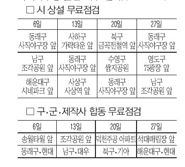 부산광역시는 7월 한 달간 매주 금요일 오전10시∼오후3시 자동차 배출가스 무료 측정 및 장비를 점검해 준다. 동래구 사직야구장 앞은 매주 실시.(888-6745)