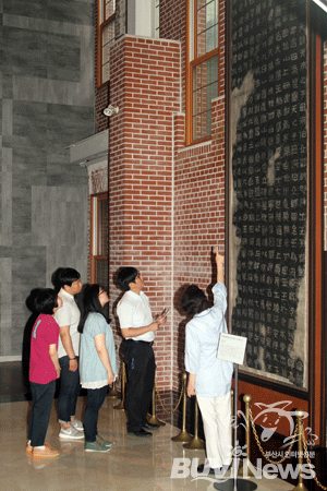 - 동아대박물관을 찾는 관람객이 해마다 크게 증가하고 있다(사진은 동아대박물관이 소장하고 있는 광개토대왕릉비 탁본 앞에서 관람객들이 도슨트의 설명을 듣고 있는 모습).