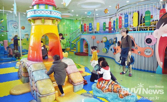 부산육아종합지원센터는 무료로 책을 빌려주는 도서관과 체험실을 갖추고 있다(사진은 센터 내 튼튼나라 체험실을 찾은 아이와 부모들).▲쑥쑥나라 체험실