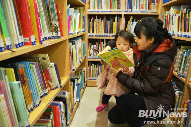 그루터기 보육도서관에서 아이와 엄마가 함께 동화책을 고르고 있는 모습.■그린나래 장난감도서관
