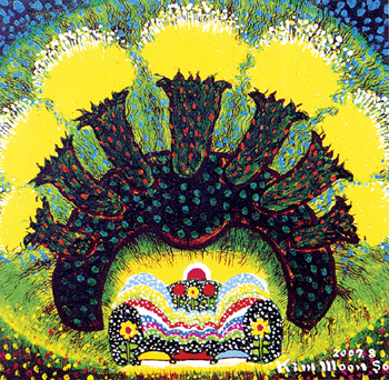 고희를 넘긴 김 화백이 어린 시절의 소중한 추억을 담아 열 여덟 번째 개인전<사진은 김문수 작 '태양을 품은 꽃 이야기'>을 열고 있다. 오는 13일까지 수영구문화센터 2층 전시실(광안리해수욕장 호메르스호텔 옆).