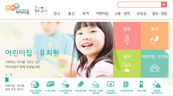 - 저출산 해결을 위해 정부가 다양한 정책을 펼친다는 뉴스가 연일 나온다. 그러나 정작 우리 가정에서 받을 수 있는 서비스가 어떤 것이 있는지 잘 모른다고? 임신을 계획하고 있다면, 아이가 있는 가정이라면 주목해야 할 임신육아종합포털 '아이사랑'을 소개한다.보건복지부가 운영하는 '아이사랑'(childcare.go.kr)은 임신계획, 출산, 육아부터 어린이집 정보까지 부모에게 필요한 다양한 맞춤형 서비스를 제공한다. 메뉴는 크게 임신, 출산, 육아, 어린이집 등으로 구성돼 있다.·임신·출산 : 계획임신을 위해 받아야 할 예방접종 등 임신 전 준비부터 출산 준비, 산후관리, 산후우울증, 순산노하우 등에 관한 다양한 정보를 제공한다. '임신(출산) 지원 서비스'를 클릭하면 임신·출산 의료비 지원, 산모·신생아 건강관리, 고위험 임산부 의료비 지원, 근로자 지원제도 등 정부의 다양한 지원 서비스와 신청방법을 검색할 수 있다.·육아 : 아이의 월령별 발달과 예방접종 정보, 이유식백과, 육아 정보 등을 제공한다. 아이의 연령(개월)과 신장을 입력하면 성장발달을 점검할 수 있고, 부모의 신장을 토대로 아이의 예상 키 등을 알아보거나 소아비만 측정 등을 할 수 있다. 아이의 성장에 따른 아빠의 역할과 아빠의 놀이활동 등에 대한 정보도 제공한다.·어린이집 : 최근 부모들이 가장 많이 이용하고 있는 서비스 중 하나이다. 지역별 어린이집, 오후 6시 이후 종일반 운영 어린이집 등 정보를 검색하고 입소대기 신청을 할 수 있다. 어린이집 평가인증제도에 따라 보육환경·운영관리, 상호작용, 건강과 영양, 안전 등 6가지 지표를 비교해 어린이집을 선택할 수 있다.어린이집에 들어간 이후에는 '보육료 결제' 서비스를 이용할 수 있다. '보육료 결제'를 온라인으로 바로 할 수 있고, 국가지원금과 실지출금 등 상세한 결제내역을 확인할 수 있다. 어린이집 이용 불편 신고도 할 수 있다.·상담 : 임신·난임·모유수유·산전후우울증·보육·어린이집 이용 등에 대한 전문가 상담을 받을 수 있다. 상담내용에 따라 게시판을 통한 온라인 상담, 전화 및 방문상담, 야간 심리 상담 등이 가능하다.