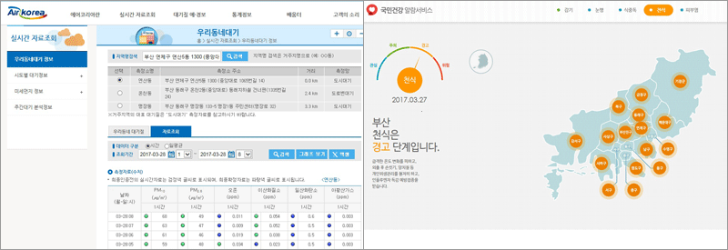 '우리동네 대기질(에어코리아, www.airkorea.or.kr)'은 미세먼지 등 전국 대기오염물질 농도 정보를 실시간으로 서비스한다. 대기오염도를 이해하기 쉽게 지수화해 색상으로 제공하는 것이 특징이다. 미세먼지(PM10), 초미세먼지(PM2.5), 오존(O3), 일산화탄소(CO), 아황산가스(SO2), 이산화황(NO2) 등으로 대기오염 물질을 구분해 서비스한다. 미세먼지 예보를 보고 황사 전용 마스크를 미리 챙길 수 있어 유용하다.