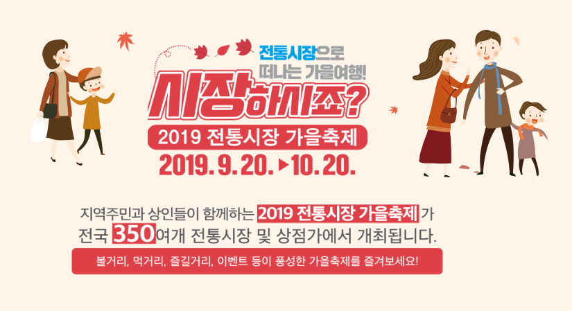 부산의 재래시장 곳곳에서 펼쳐지는, 2019 전통시장 가을축제에 방문하셔서, 훈훈한 정도 느끼고 착한 가격의 알찬 상품도 구입해보시기를 바랍니다.