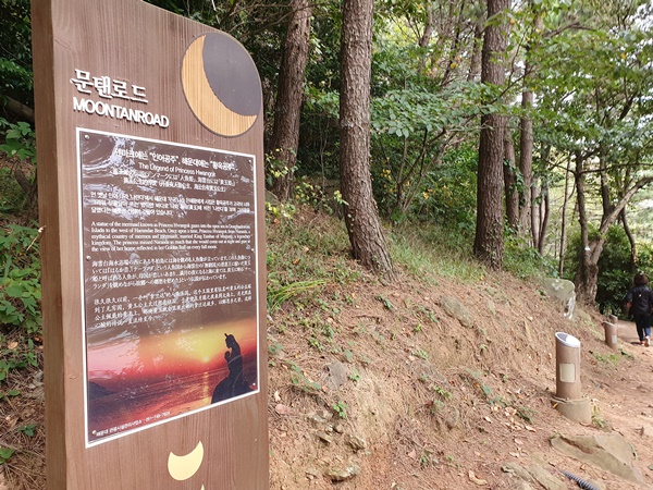 ▶ 사진은 문탠로드 근처의 갈맷길 입구. 안녕하세요 이곳은 달빛기운이 가득한 갈맷길입니다. 라고 쓰여있다. 문화체육관광부와 한국관광공사가 지정한 사진직기 좋은 경관명소 입구이다.