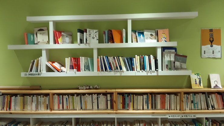 △ 초록색 벽면에 설치된 책선반에 책이 진열되어 있는 모습.