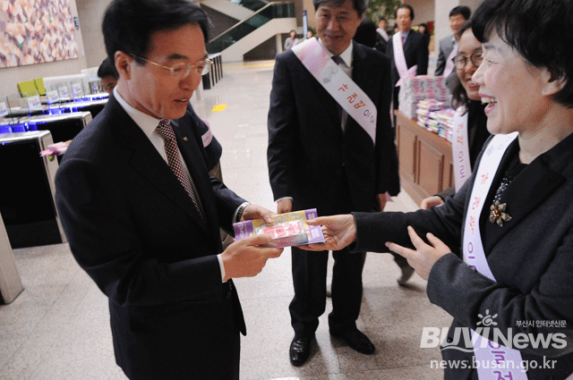 부산시가 11월 11일 농업인의 날을 기념해 '가래떡의 날' 캠페인을 열고 시민들에게 가래떡을 나눠줬다(사진은 11일 아침 부산시청 1층 홀에서 가래떡을 나눠주고 있는 모습).