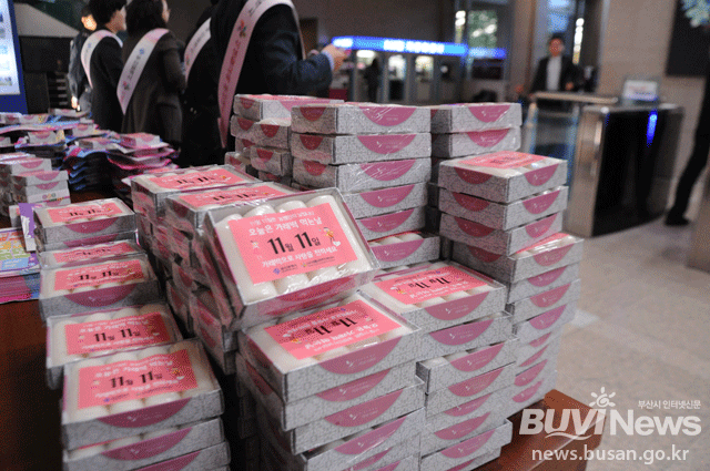부산광역시와 (사)식생활교육부산네트워크는 '농업인의 날'과 '가래떡의 날'인 11월 11일을 맞아 시민들에게 가래떡을 나눠주는 홍보 캠페인을 열었다. 공무원 20명과 네트워크 회원 70명은 이날 오전 7시~9시 부산시청, 부산대, 해운대 관광고, 화명고 앞에서 공무원·시민·학생들에게 홍보 리플릿과 가래떡 8천여개를 나눠줬다.