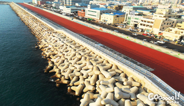 조망로 바닥과 호안 벽면은 영도를 상징하는 동삼동 혁신도시와 영도 통과도로, 노을 등을 형상화한 컬러무늬 콘크리트로 경관을 조성해 삭막한 분위기도 덜었습니다.