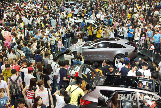 부산국제모터쇼가 한 달 앞으로 다가왔다. 부산시는 2014 부산국제모터쇼를 다음달 29일 프레스데이, 30일 개막식을 시작으로 6월8일까지 해운대 벡스코에서 개최한다(사진은 2012년 벡스코에서 열린 부산국제모터쇼를 찾은 관람객 모습).국내 6개·해외 16개 완성차 브랜드 참가