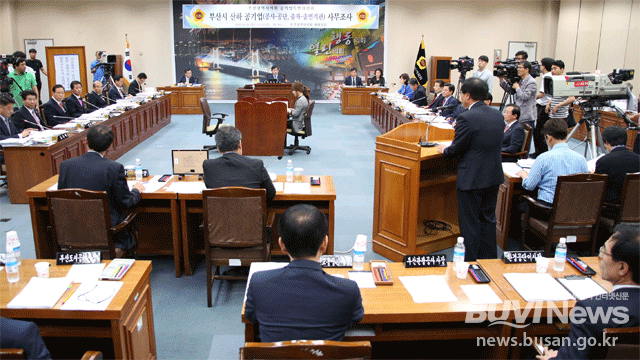 부산시의회 공기업특별위원회는 지난 17일 부산시 산하 공사·공단 21곳에 대한 조사활동 결과 보고서를 발간하고 1년간의 특위 활동을 마무리했다(사진은 지난 6월 시의회 대회의실에서 열린 시 산하 공기업과 출자·출연기관 등 21개 기관에 대한 합동 조사 모습).특위는 기관 주요사업의 설립목적과 부합 여부 및 업무중복 등 효율성에 조사의 방점을 뒀다. 특위는 3선의 김영욱(부산진구4) 의원이 위원장을, 2선의 박중묵(동래구1) 의원이 부위원장을 맡았다. 이희철(남구1), 조정화(사하구4), 정명희(새정치연합·비례대표), 김병환(부산진구3), 진남일(남구4), 강무길(해운대구4), 신현무(사하구2), 이상민(북구4), 김진홍(동구1), 김종한(동구2), 최준식(해운대구2), 이종진(북구3), 오은택(남구2) 의원 등이 참여했다.