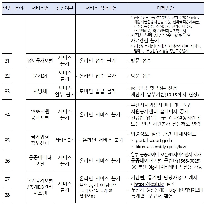 국가정보자원관리원 전산시설 화재발생으로 인한 부산시 시스템 일부 서비스 중단 안내