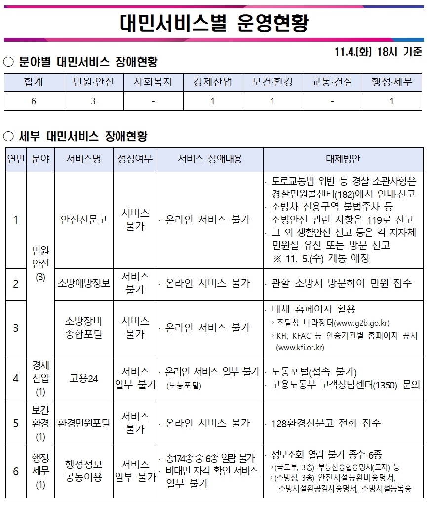 서비스 복구 현황 및 공식 안내는 각 부처와 기관의 공식 홈페이지 공지사항에서만 확인해 주시기 바랍니다.