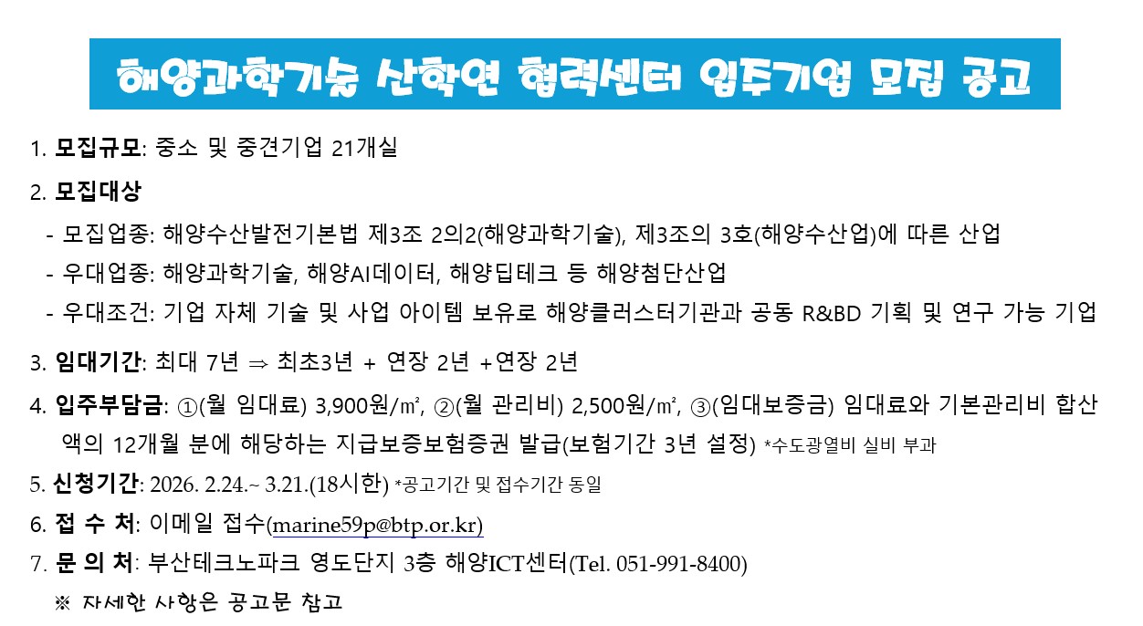 해양과학기술 산학연 협력센터 입주기업 모집 공고